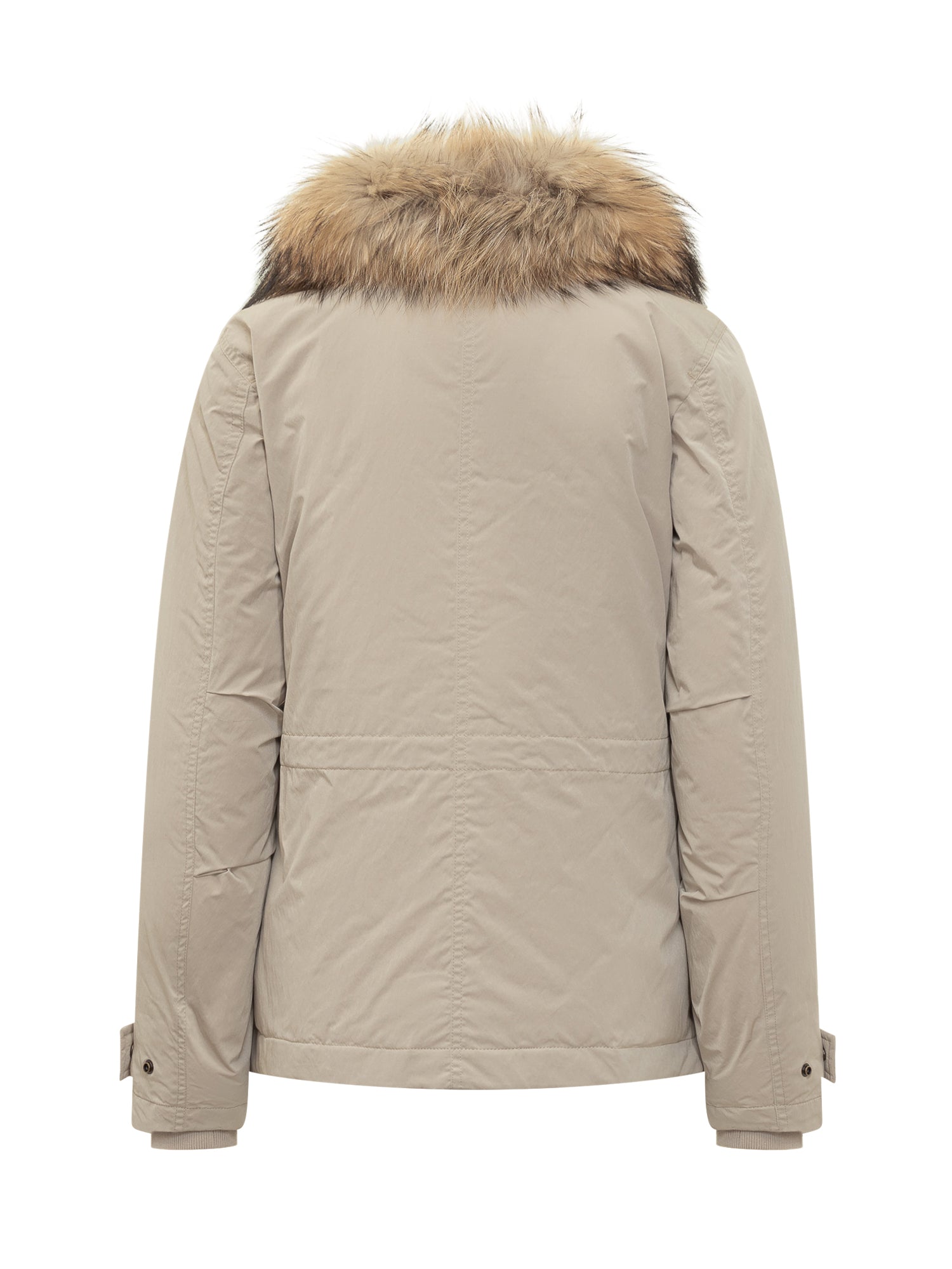Parka corto Woolrich Grace Fur in beige, con cappuccio bordato in pelliccia e tasche con pattina.