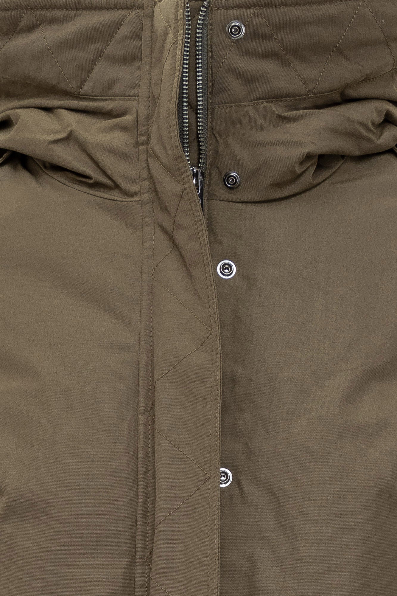 Piumino Woolrich in cotone tecnico verde con cappuccio alto, chiusura con zip e bottoni a pressione.
