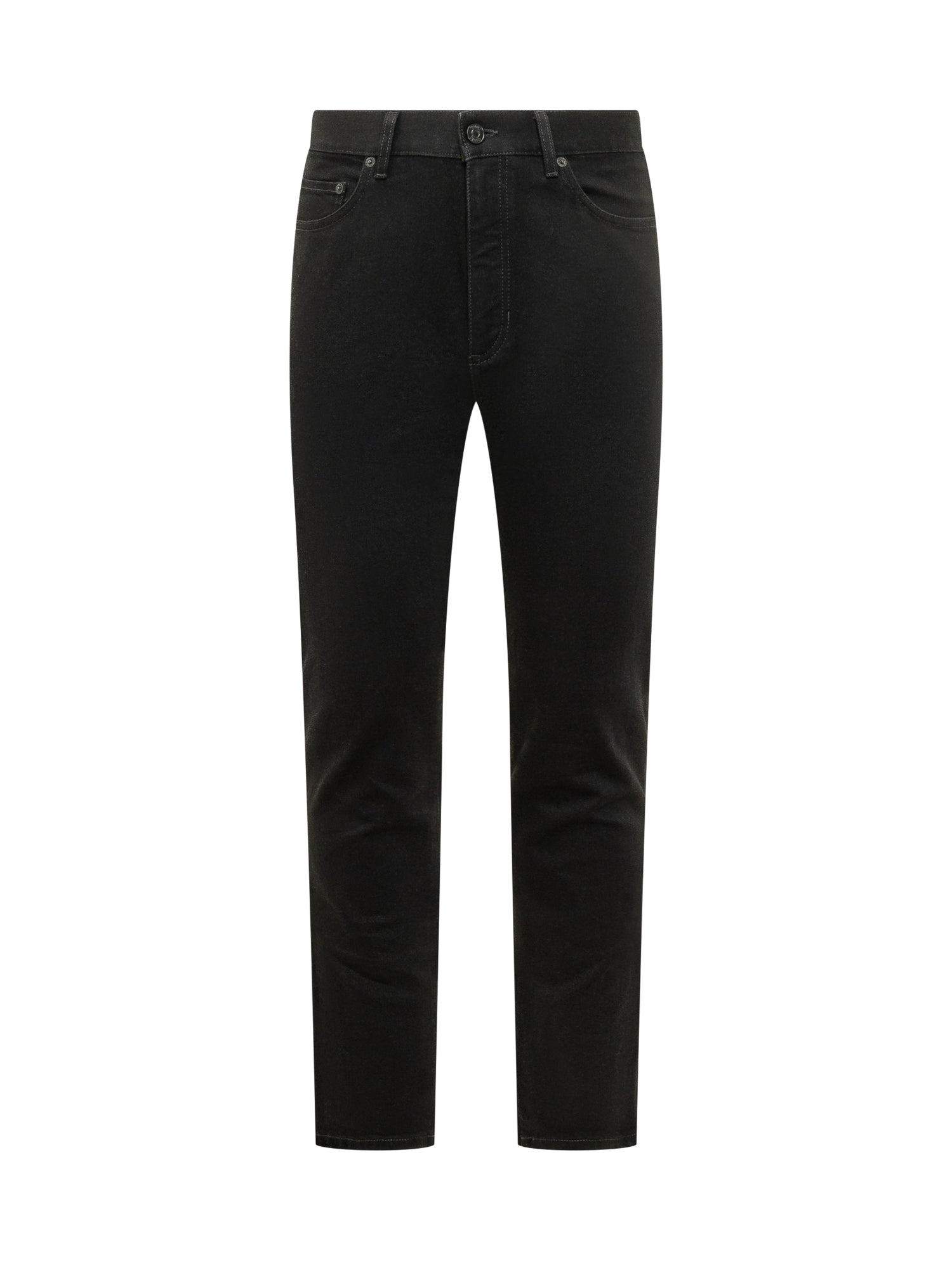 Jeans a cinque tasche con vestibilità regolare, passanti per cintura e chiusura con bottone e zip.