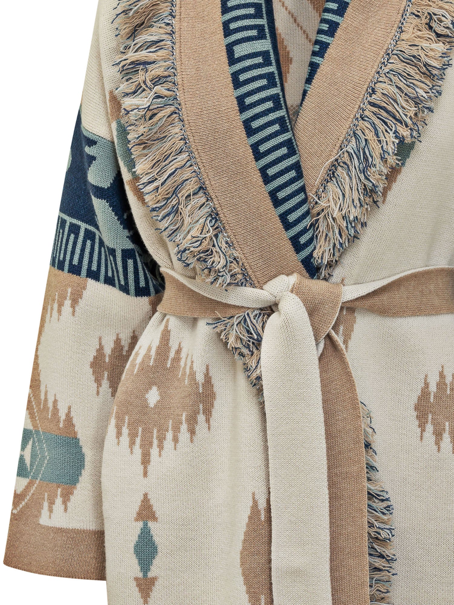 Long jacquard coat with fringed detailing and shawl collar, finished with a waist belt.
