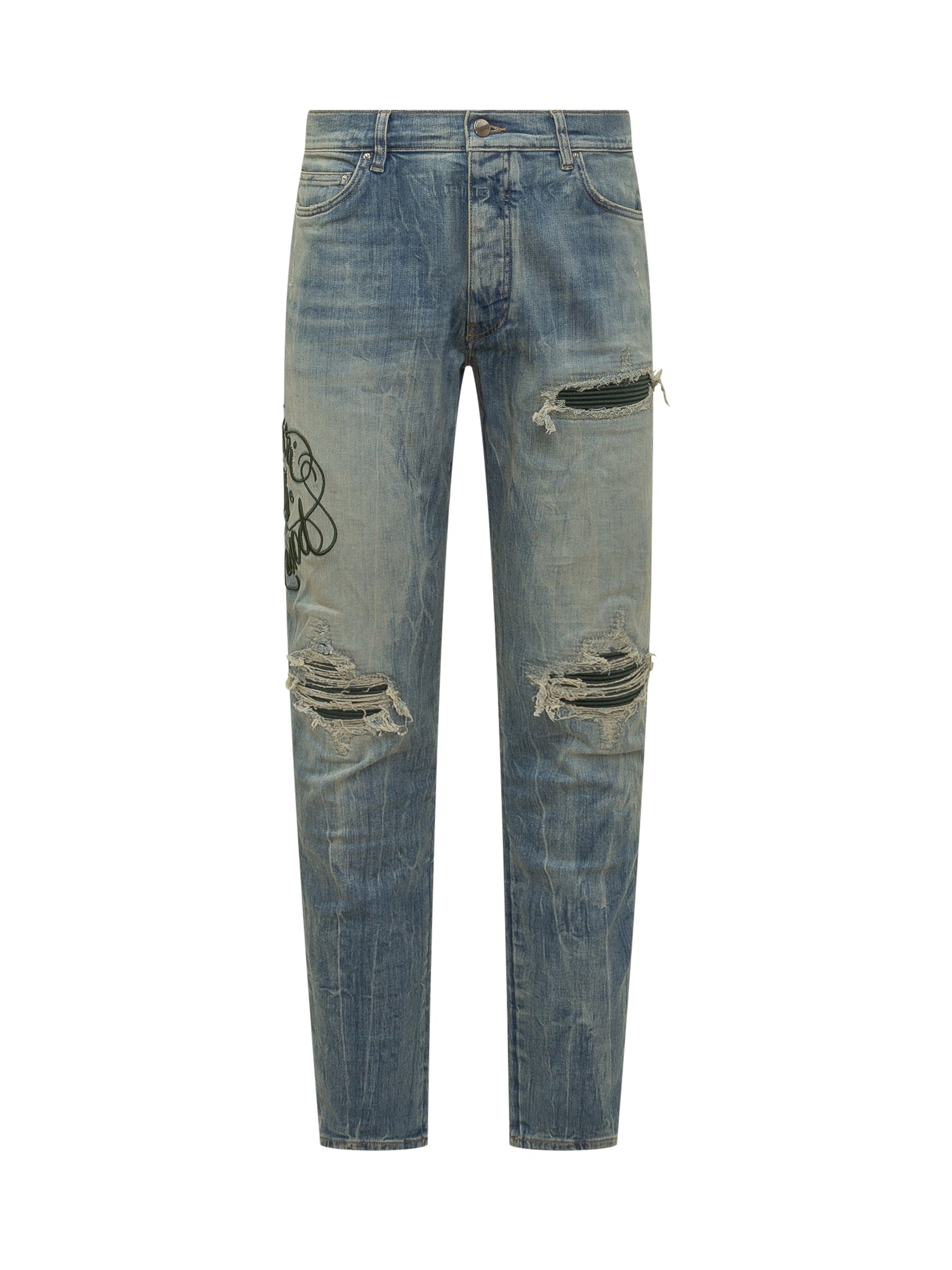 Slim fit jeans featuring a worn-effect finish, distressed details and side embroidery. Bold, contemporary design perfect for casual and streetwear looks.