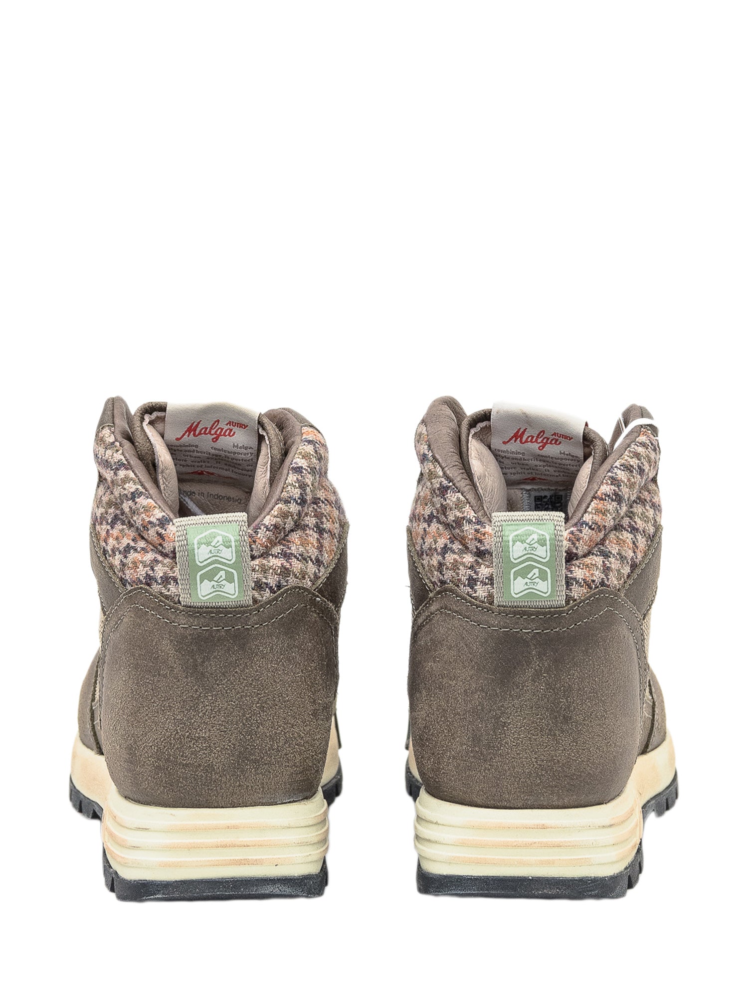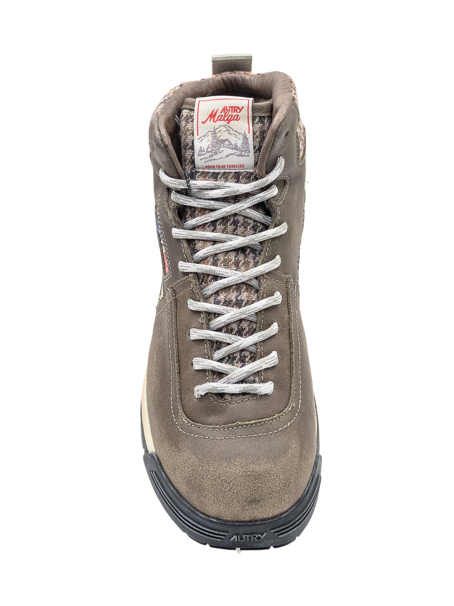 Mid suede boot with soft padded ankle and patterned inner lining. Lug sole provides optimal grip and contrast laces.