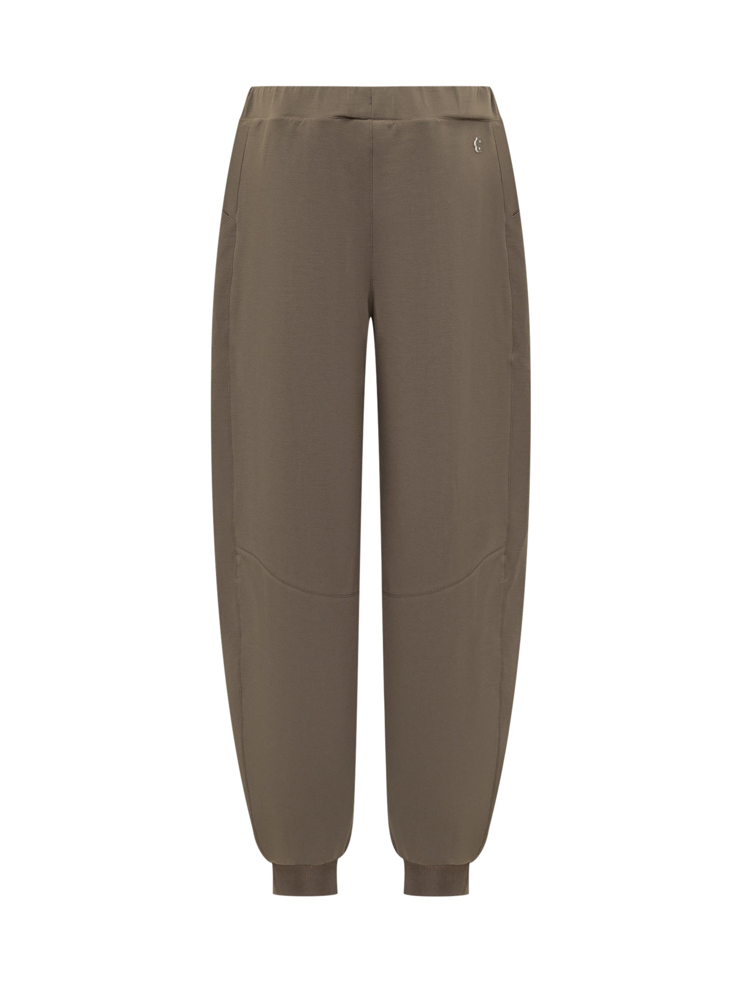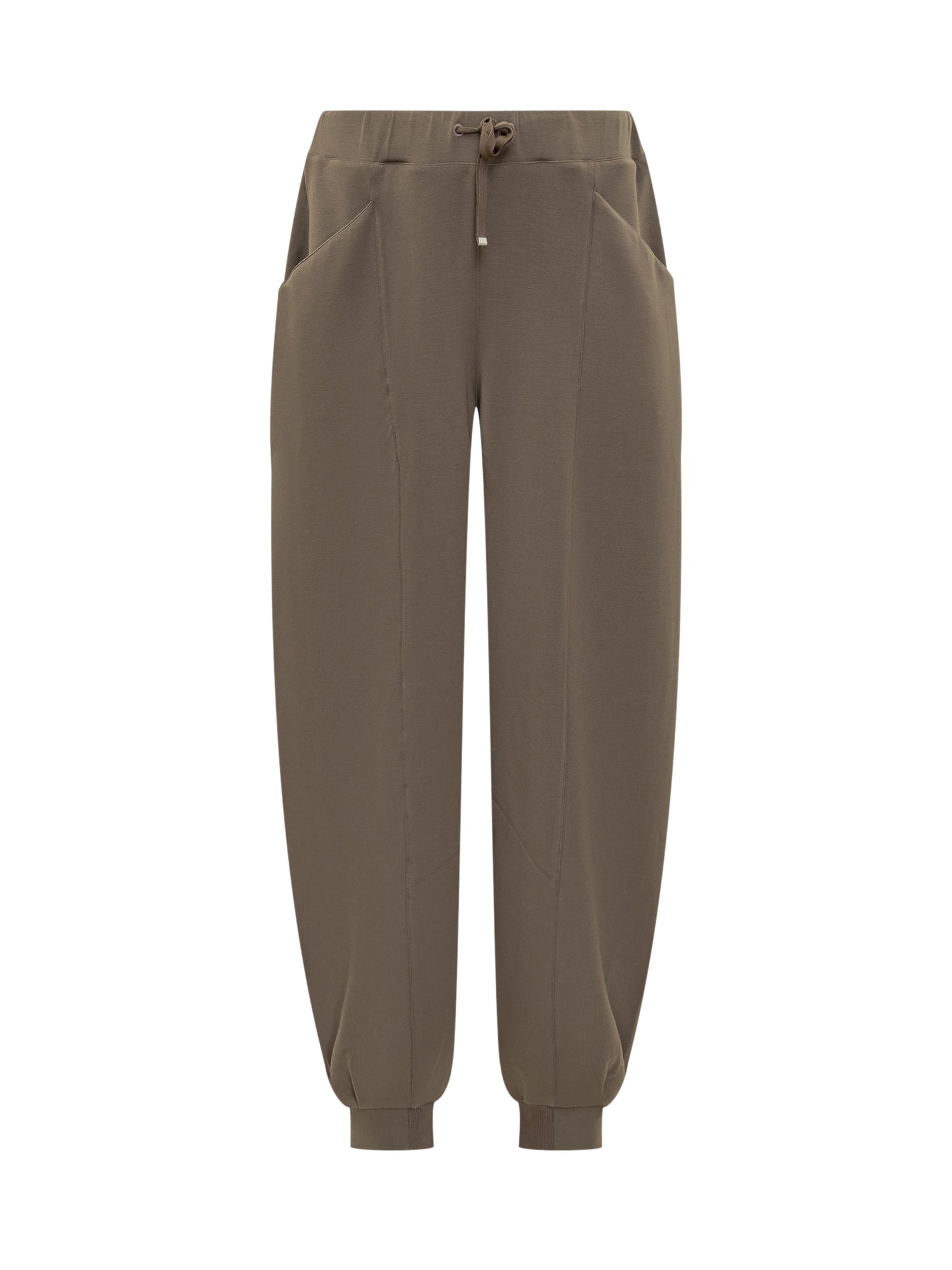 Boss taupe cotton jogger pants with elastic waist and adjustable drawstring. Side pockets and ribbed cuffs.