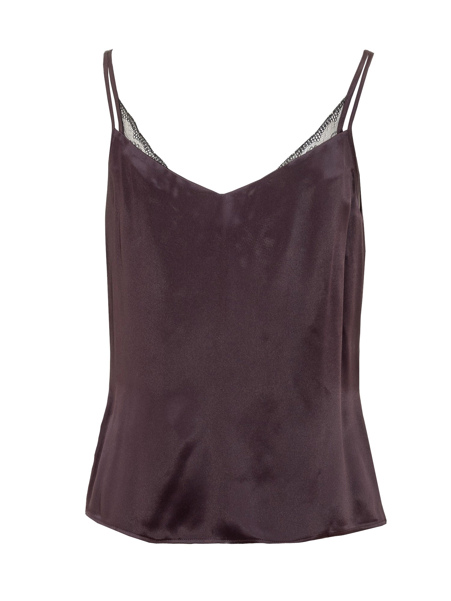 Satin-effect silk camisole with V-neckline and delicate lace details. Fluid and feminine shape with central drape enhancing the silhouette.