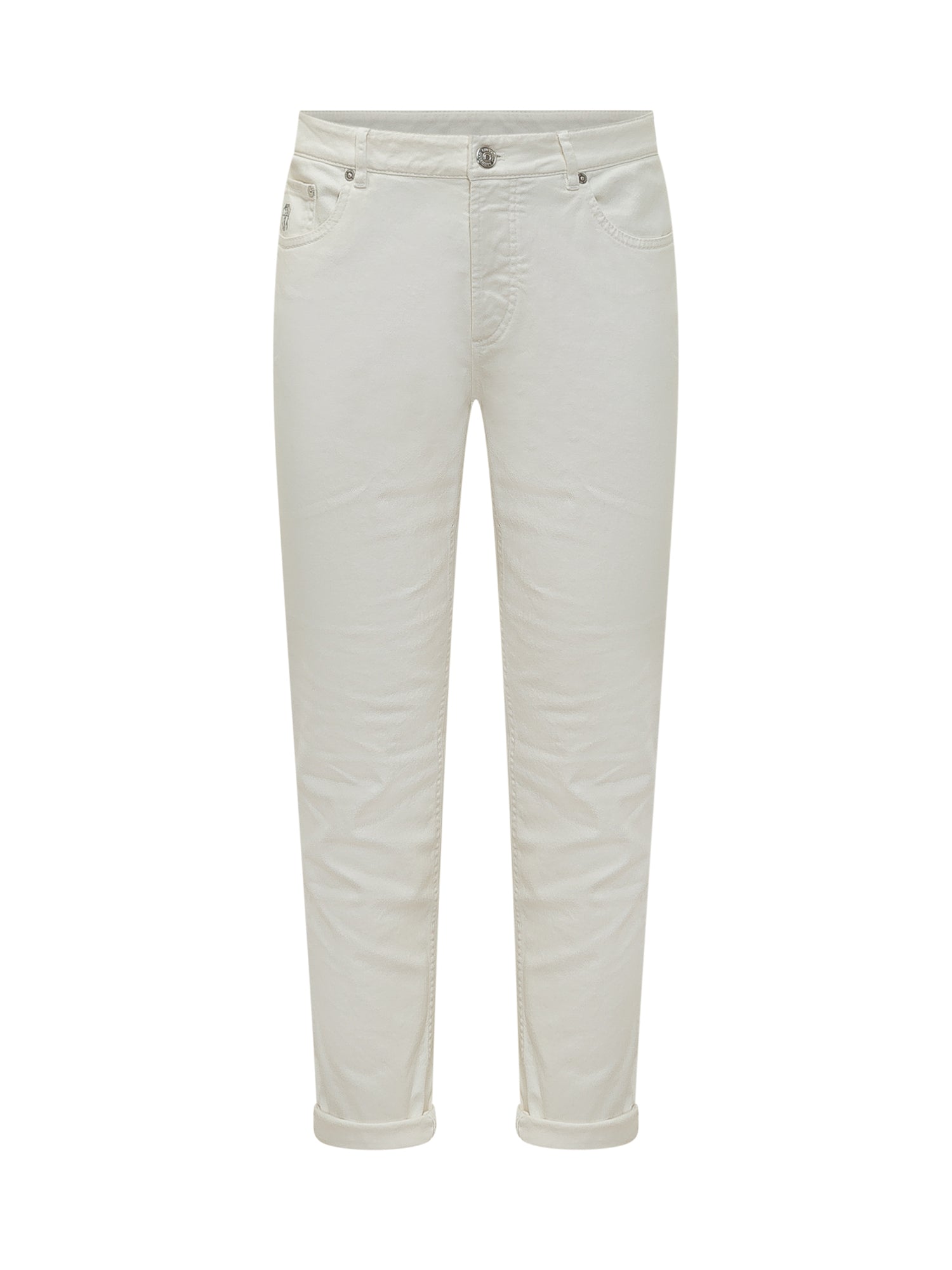 Dyed denim pants, straight leg with mid rise fit, five pocket design and belt loops, button closure, cuffed hem.