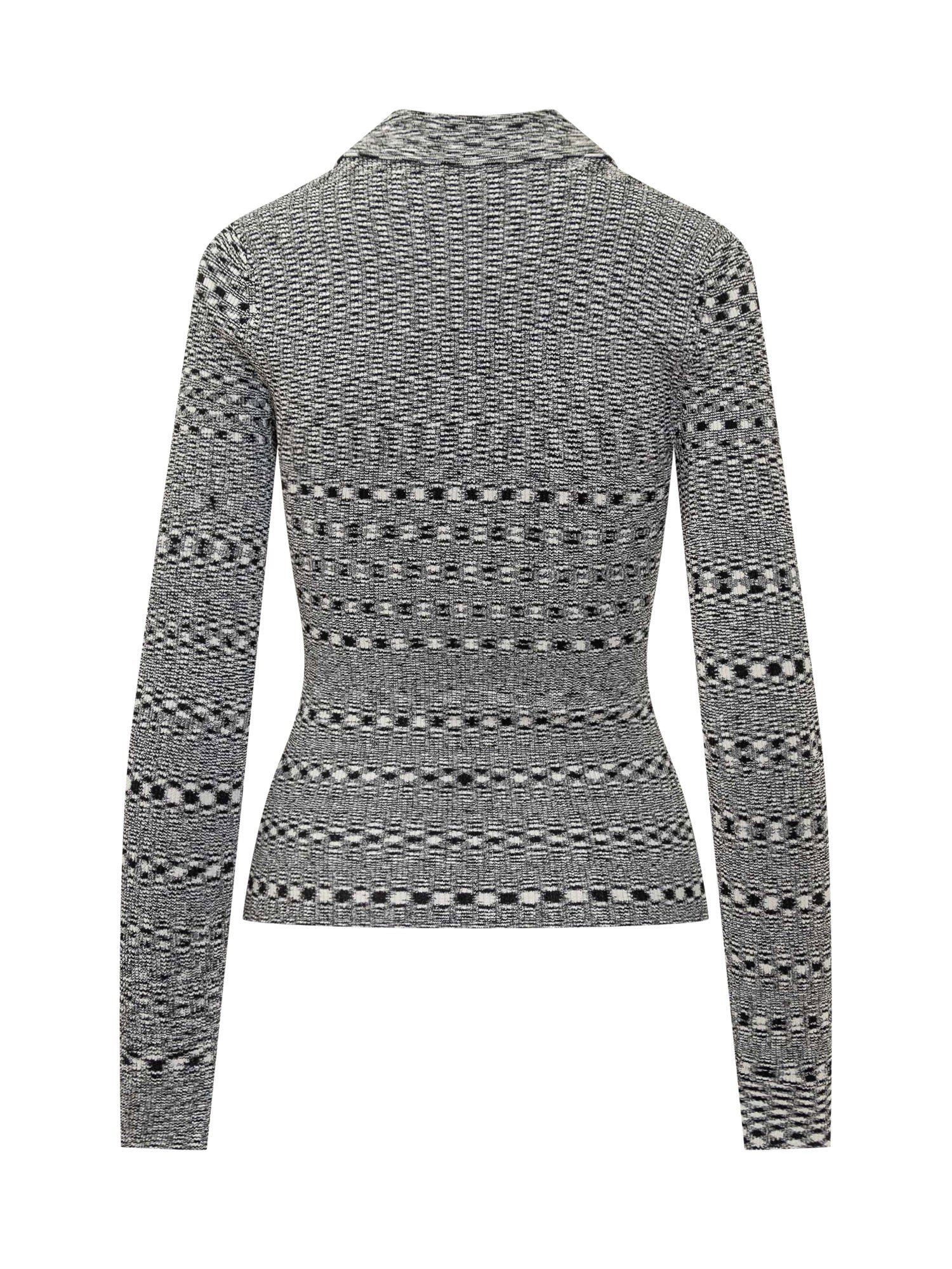 Ganni jacquard knit top in grey and black with polo collar and gold-tone buttons.