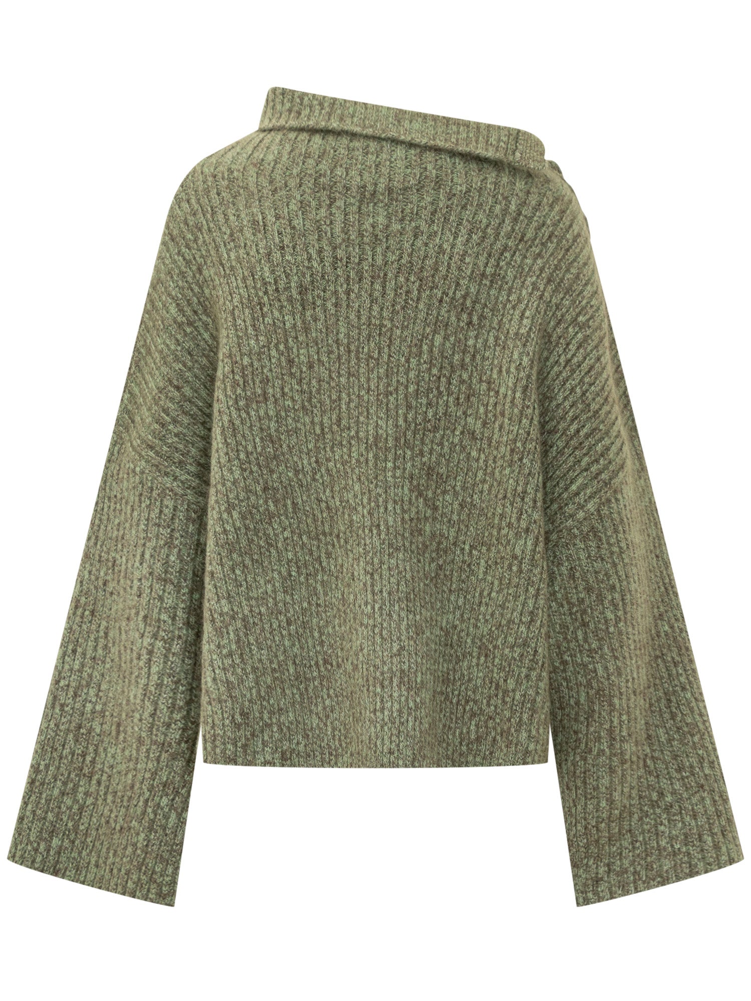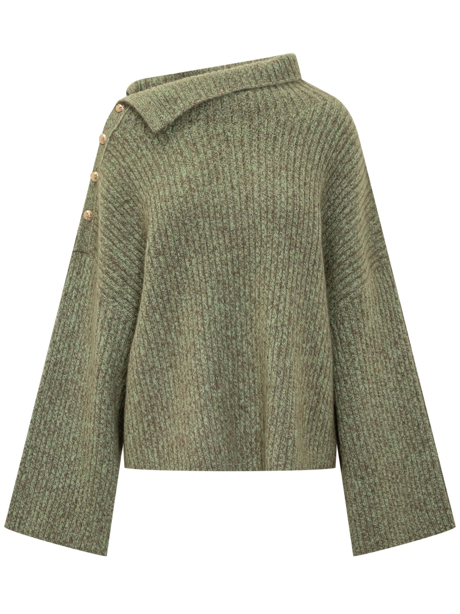Ganni ribbed knit sweater in green mélange with relaxed fit. Asymmetric collar and decorative shoulder buttons.