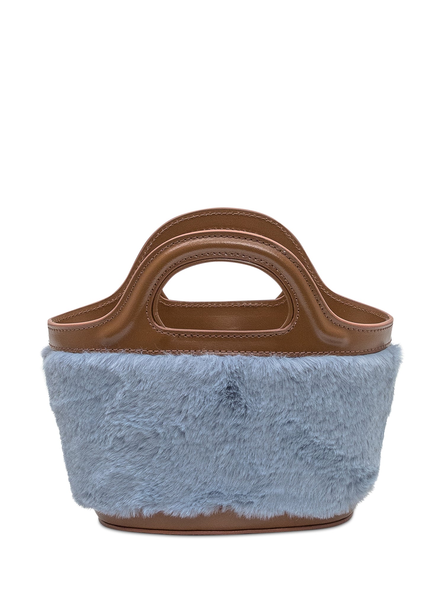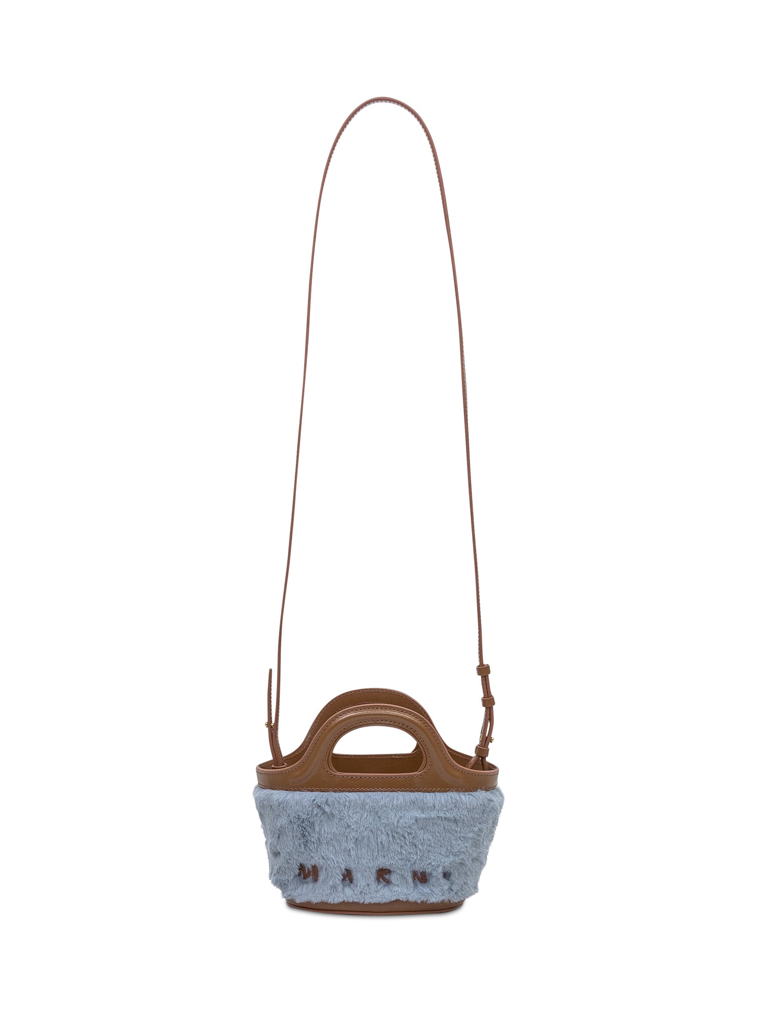Tote bag in brown leather with blue fur details and embroidered logo.