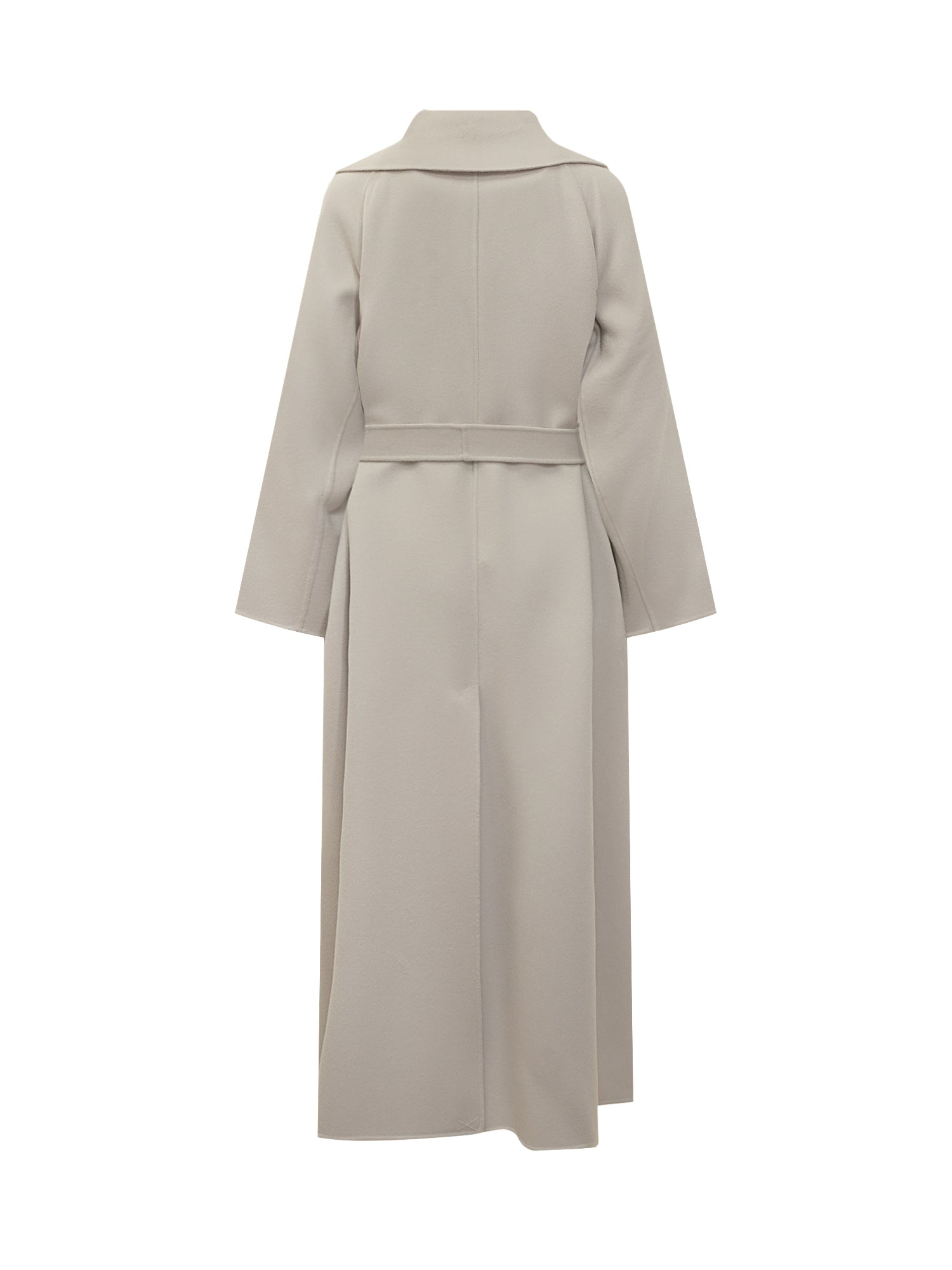 Long wool coat with soft cut, classic lapels, patch pockets and waist belt.