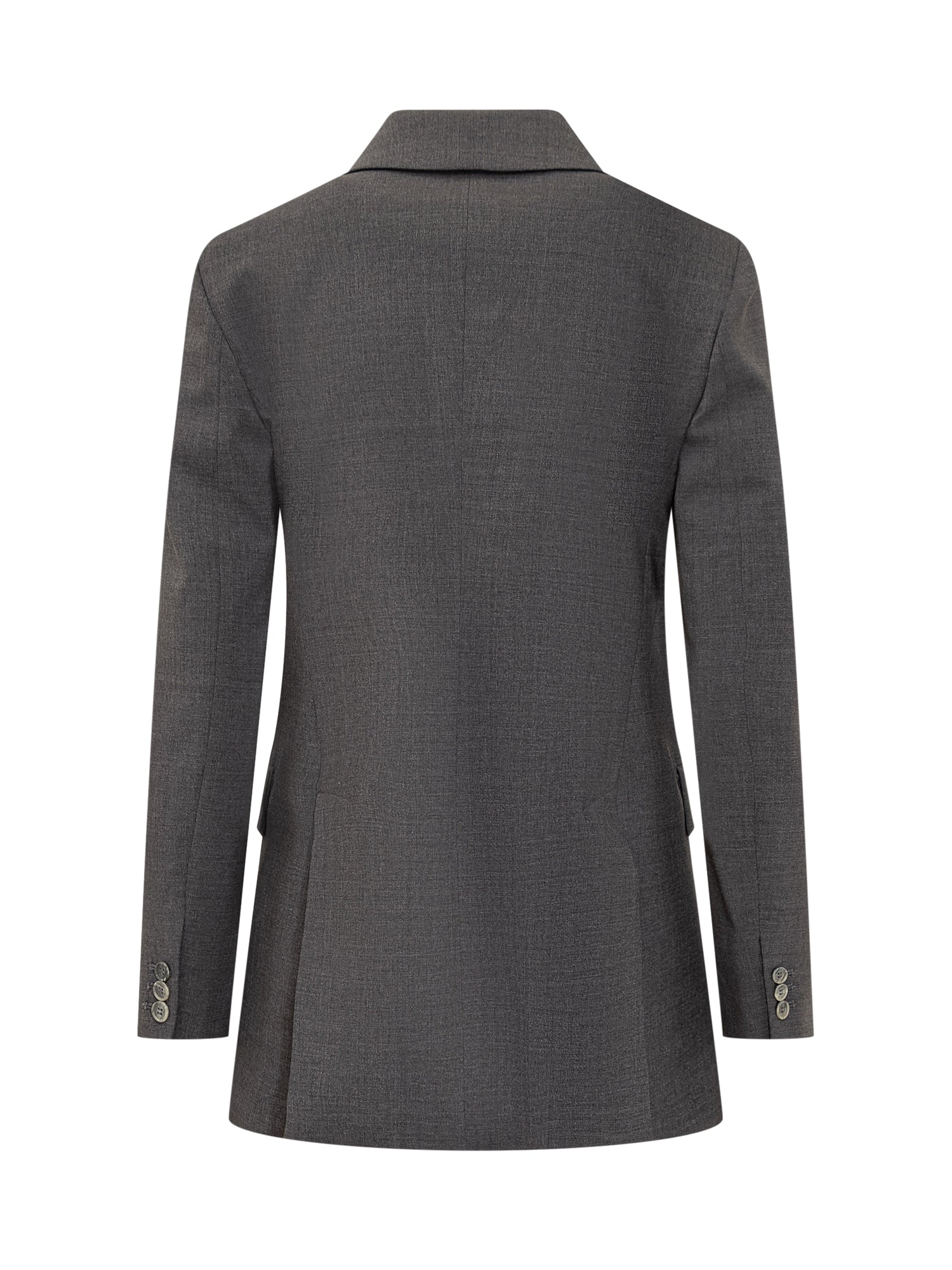 Grey double-breasted wool jacket. Lapel collar. Chest pocket. Front pockets. Button closure.
