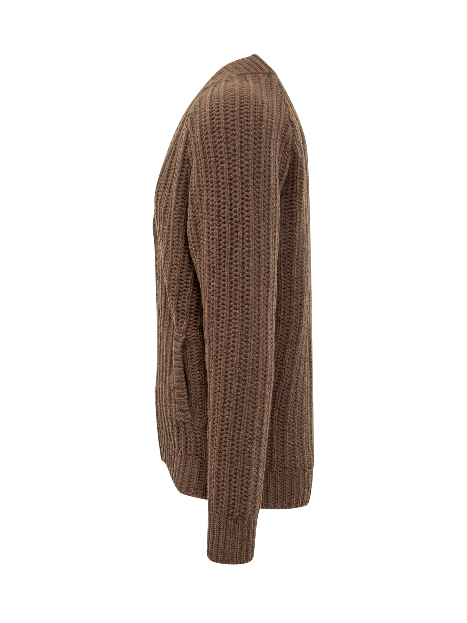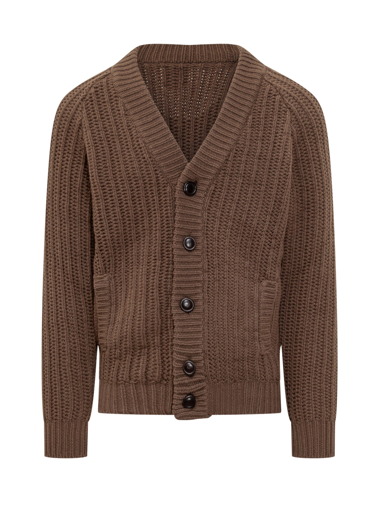 Rakki ribbed knit cardigan featuring V-neck and front button closure. Designed with wide texture and side pockets, finished with ribbed trims.