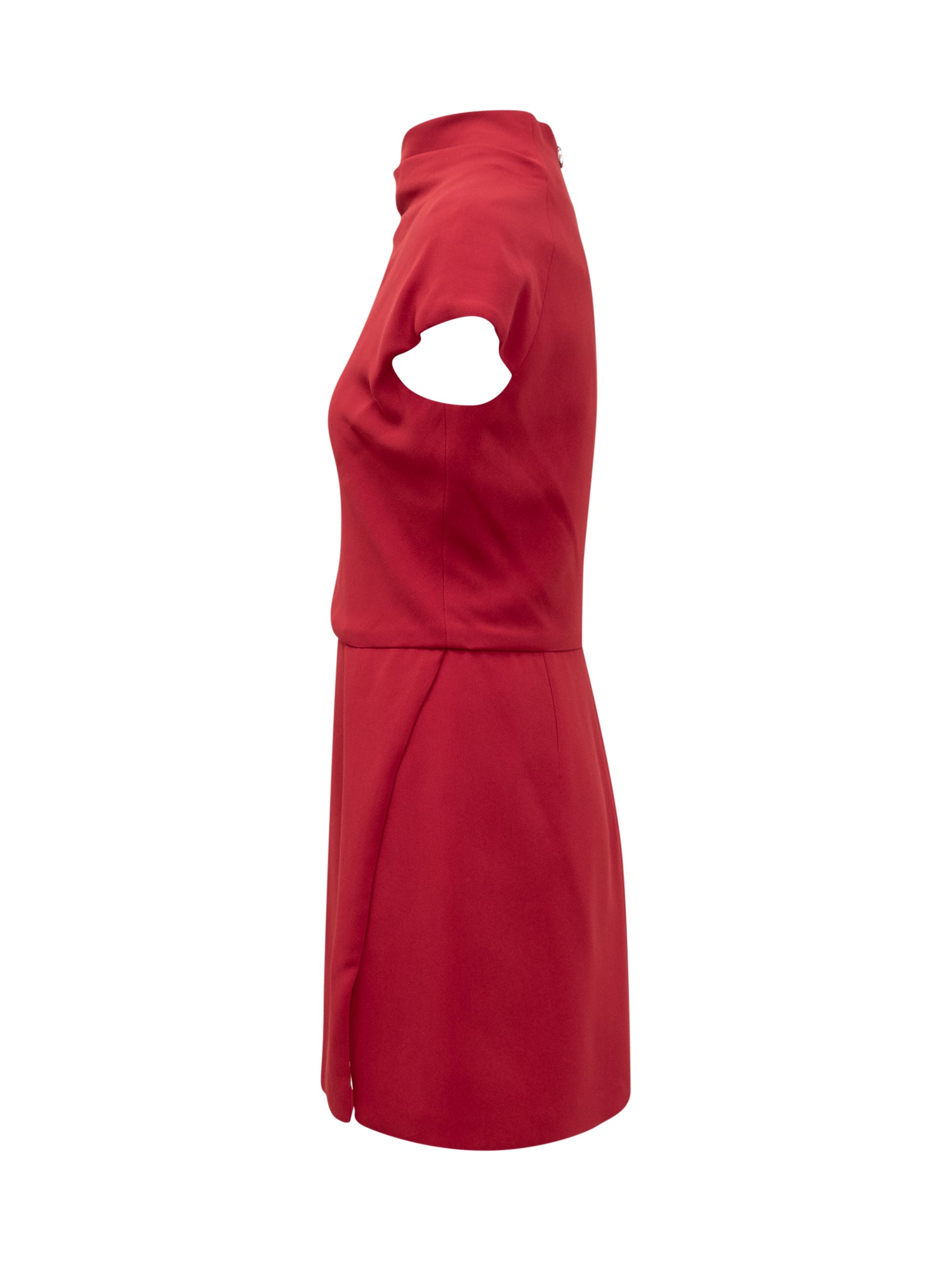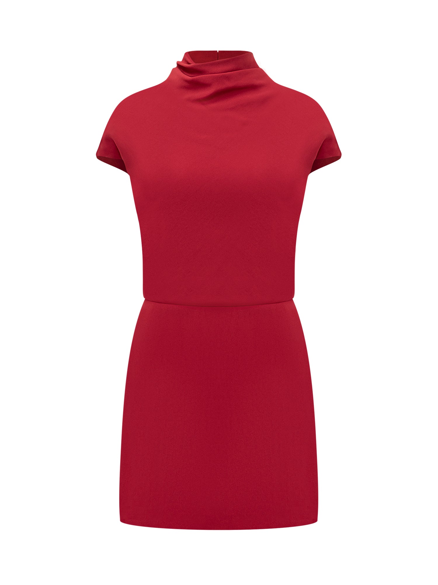 Mini dress in soft cady. High draped collar. Hidden zip closure on the back. Sleeves with flap. Front slit.